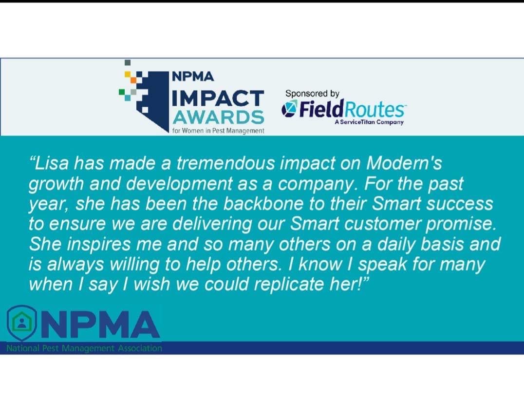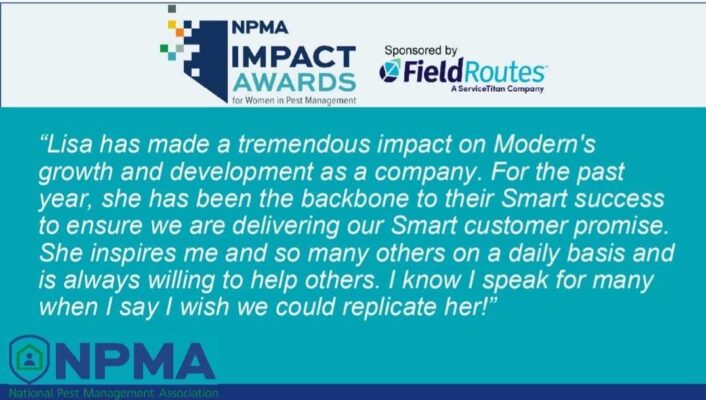 Modern Pest is proud to announce that Operations Liaision Lisa Cloutier has been awarded with a National Pest Management Association (NPMA) Impact Award for Women in Pest Management. The award was presented at the annual NPMA Women’s Forum in Charleston, South Carolina on May 10 to recognize her contribution to the Pest Management Industry.